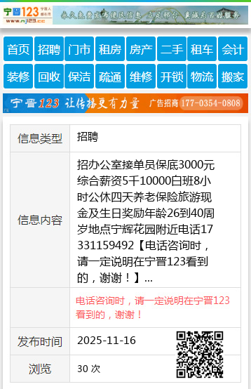 招办公室接单员保底3000元综合薪资5千10000白班8小时公休四天养老保险旅游现金及生日奖励年龄26到40周岁地点宁辉花园附近电话17331159492 【电话咨询时,请一定说明在宁晋123看到的,谢谢!】 |