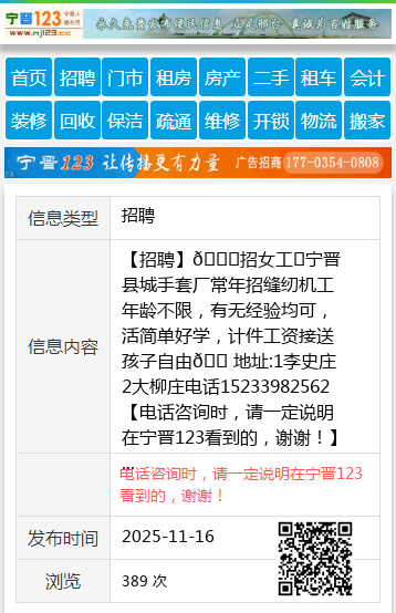 【招聘】🎉招女工✅宁晋县城手套厂常年招缝纫机工年龄不限,有无经验均可,活简单好学,计件工资接送孩子自由🏠地址:1李史庄2大柳庄电话15233982562 【电话咨询时,请一定说明在宁晋123看到的,谢谢!】 |