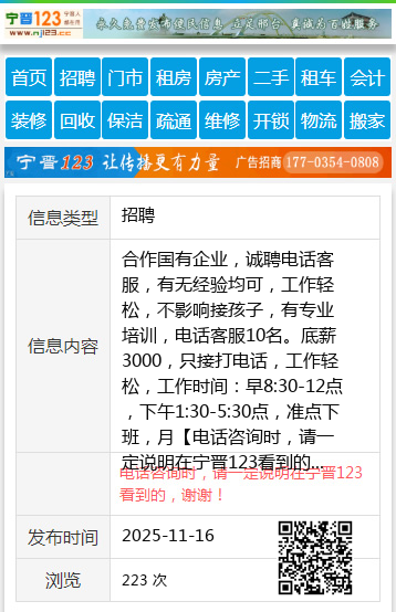 合作国有企业,诚聘电话客服,有无经验均可,工作轻松,不影响接孩子,有专业培训,电话客服10名。底薪3000,只接打电话,工作轻松,工作时间:早8:30-12点,下午1:30-5:30点,准点下班,月 【电话咨询时,请一定说明在宁晋123看到的,谢谢!】 |
