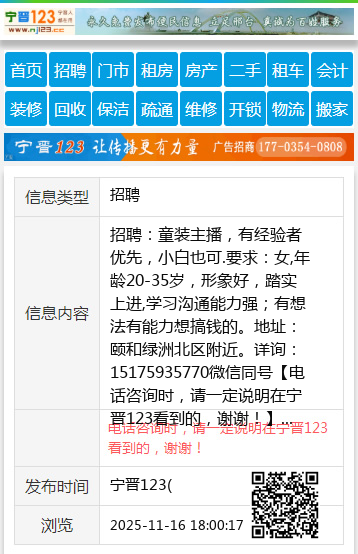招聘:童装主播,有经验者优先,小白也可.要求:女,年龄20-35岁,形象好,踏实上进,学习沟通能力强;有想法有能力想搞钱的。地址:颐和绿洲北区附近。详询:15175935770微信同号 【电话咨询时,请一定说明在宁晋123看到的,谢谢!】 |
