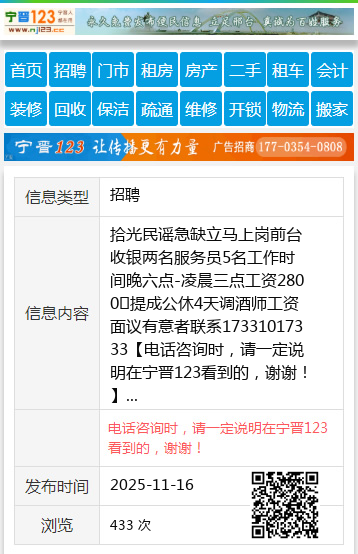| 防骗提醒: | 宁晋123(www.nj123.cc)提醒您:手工活、网络兼职、刷单,都是骗子!凡以各种名义收取费用的都是骗子!找工作是往兜里挣钱,让你往外掏钱的都是骗子!异地招聘请提高警惕,谨防诈骗! |