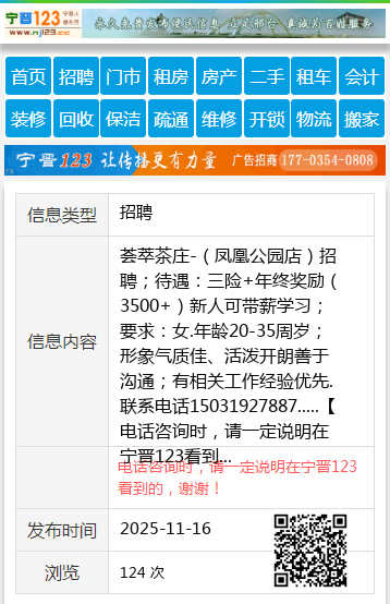 荟萃茶庄-(凤凰公园店)招聘;待遇:三险+年终奖励(3500+)新人可带薪学习;要求:女.年龄20-35周岁;形象气质佳、活泼开朗善于沟通;有相关工作经验优先.联系电话15031927887.....
