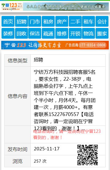 宁纺万方科技园招聘客服5名,要求女性,22-38岁,电脑熟悉会打字,上午九点上班到下午六点下班,午休一个半小时,月休4天。每月团建一次,月薪4000+。有意者联系15227670557 【电话咨询时,请一定说明在宁晋123看到的,谢谢!】 |