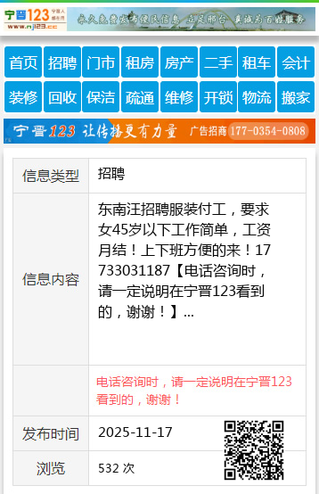 宁晋123(www.nj123.cc)提醒您:手工活、网络兼职、刷单,都是骗子!凡以各种名义收取费用的都是骗子!找工作是往兜里挣钱,让你往外掏钱的都是骗子!异地招聘请提高警惕,谨防诈骗!