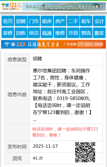 惠尔信集团招聘:车间操作工7名,男性,身体健康,踏实能干,薪资面议。工作地址:赵庄村南工业园区,联系电话:0319-5850809。 【电话咨询时,请一定说明在宁晋123看到的,谢谢!】 |