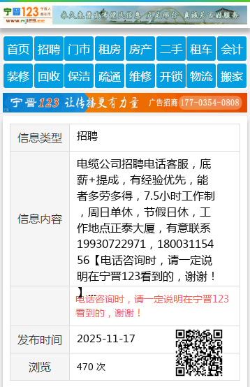 电缆公司招聘电话客服,底薪+提成,有经验优先,能者多劳多得,7.5小时工作制,周日单休,节假日休,工作地点正泰大厦,有意联系19930722971,18003115456 【电话咨询时,请一定说明在宁晋123看到的,谢谢!】 |