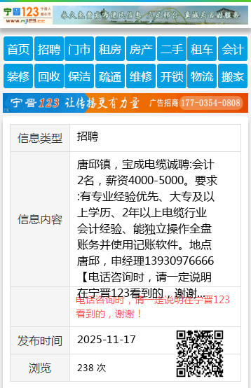 唐邱镇,宝成电缆诚聘:会计2名,薪资4000-5000。要求:有专业经验优先、大专及以上学历、2年以上电缆行业会计经验、能独立操作全盘账务并使用记账软件。地点唐邱,申经理13930976666 【电话咨询时,请一定说明在宁晋123看到的,谢谢!】 |