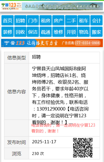 宁晋县天山凤城国际B座阿坤烧烤,招聘店长1名、烧烤师傅2名、收银员2名、服务员若干,要求年龄40岁以下,身体健康,性格开朗,有工作经验优先,联系电话:13091290000 【电话咨询时,请一定说明在宁晋123看到的,谢谢!】 |