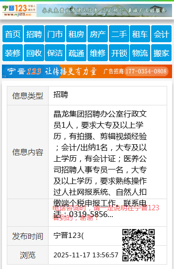 晶龙集团招聘办公室行政文员1人,要求大专及以上学历,有拍摄、剪辑视频经验;会计/出纳1名,大专及以上学历,有会计证;医养公司招聘人事专员一名,大专及以上学历,要求熟练操作过人社网报系统、自然人扣缴端个税申报工作。联系电话:0319-5856130。 【电话咨询时,请一定说明在宁晋123看到的,谢谢!】 |