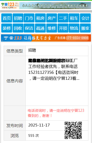 要求服从主管安排,有工厂工作经验者优先,联系电话15231127356 【电话咨询时,请一定说明在宁晋123看到的,谢谢!】 |