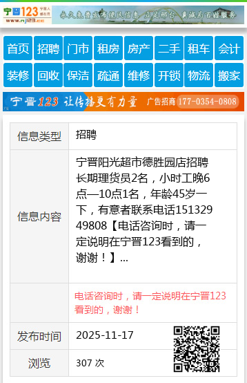 宁晋阳光超市德胜园店招聘长期理货员2名,小时工晚6点—10点1名,年龄45岁一下,有意者联系电话15132949808 【电话咨询时,请一定说明在宁晋123看到的,谢谢!】 |