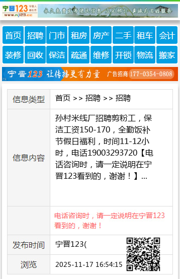 孙村米线厂招聘剪粉工,保洁工资150-170,全勤饭补节假日福利,时间11-12小时,电话19003293720