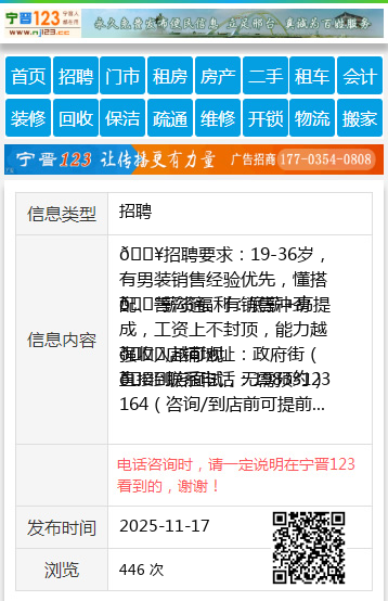 📞联系电话:19833123164(咨询/到店前可提前沟通)✨如果你懂男装、爱销售、想赚钱,快来加入我们! 【电话咨询时,请一定说明在宁晋123看到的,谢谢!】 |