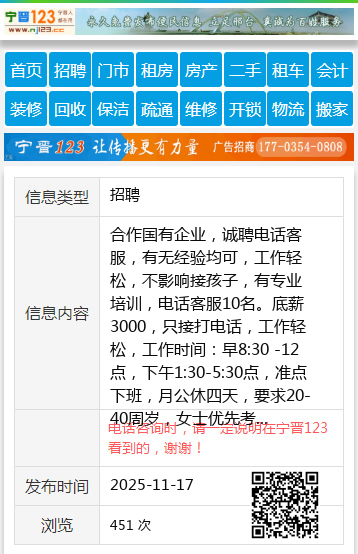 合作国有企业,诚聘电话客服,有无经验均可,工作轻松,不影响接孩子,有专业培训,电话客服10名。底薪3000,只接打电话,工作轻松,工作时间:早8:30 -12点,下午1:30-5:30点,准点下班,月公休四天,要求20-40周岁,女士优先考虑,工作简单,有无经验均可,长白班,地址:老车站附近 联系电话15731177212,名额有限,有意向请联系,20岁以下免打扰。 【电话咨询时,请一定说明在宁晋123看到的,谢谢!】 |