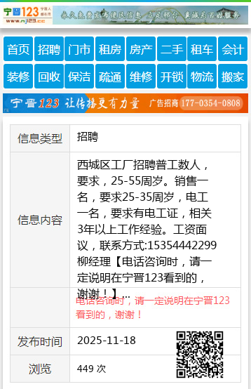西城区工厂招聘普工数人,要求,25-55周岁。销售一名,要求25-35周岁,电工一名,要求有电工证,相关3年以上工作经验。工资面议,联系方式:15354442299柳经理 【电话咨询时,请一定说明在宁晋123看到的,谢谢!】 |