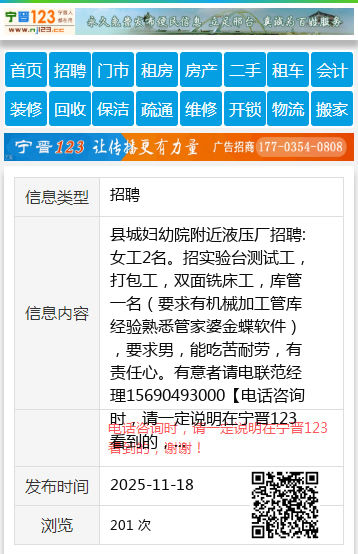 县城妇幼院附近液压厂招聘:女工2名。招实验台测试工,打包工,双面铣床工,库管一名(要求有机械加工管库经验熟悉管家婆金蝶软件),要求男,能吃苦耐劳,有责任心。有意者请电联范经理15690493000 【电话咨询时,请一定说明在宁晋123看到的,谢谢!】 |