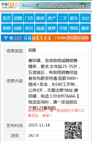 唐邱镇,宝成电缆诚聘销售精英,要求:女年龄25-35岁,五官端正,有电缆销售经验者优先薪资待遇:底薪3000+提成+奖金,8小时工作制,公休4天,无需出差!地址:唐邱镇,电话:13930976666 【电话咨询时,请一定说明在宁晋123看到的,谢谢!】 |