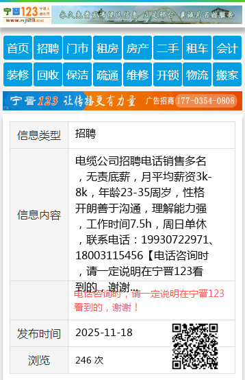 电缆公司招聘电话销售多名,无责底薪,月平均薪资3k-8k,年龄23-35周岁,性格开朗善于沟通,理解能力强,工作时间7.5h,周日单休,联系电话:19930722971、18003115456 【电话咨询时,请一定说明在宁晋123看到的,谢谢!】 |