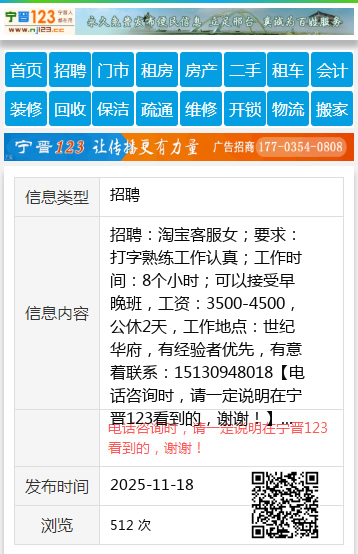 招聘:淘宝客服女;要求:打字熟练工作认真;工作时间:8个小时;可以接受早晚班,工资:3500-4500,公休2天,工作地点:世纪华府,有经验者优先,有意着联系:15130948018 【电话咨询时,请一定说明在宁晋123看到的,谢谢!】 |
