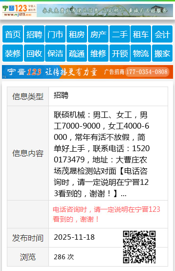 联硕机械:男工、女工,男工7000-9000,女工4000-6000,常年有活不放假,简单好上手,联系电话:15200173479,地址:大曹庄农场茂晟检测站对面 【电话咨询时,请一定说明在宁晋123看到的,谢谢!】 |