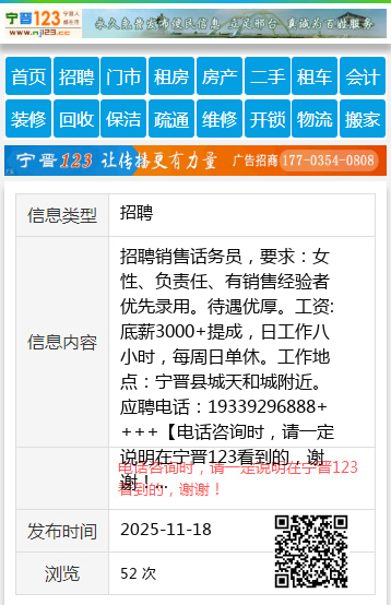 招聘销售话务员,要求:女性、负责任、有销售经验者优先录用。待遇优厚。工资:底薪3000+提成,日工作八小时,每周日单休。工作地点:宁晋县城天和城附近。应聘电话:19339296888++++ 【电话咨询时,请一定说明在宁晋123看到的,谢谢!】 |