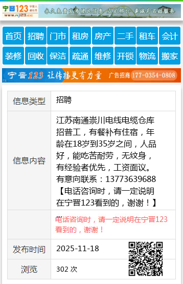 江苏南通崇川电线电缆仓库招普工,有餐补有住宿,年龄在18岁到35岁之间,人品好,能吃苦耐劳,无纹身,有经验者优先,工资面议。有意向联系:13773639688