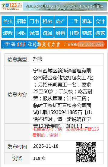 宁晋西城区韵泽通管理有限公司诺金仓储招打包女工2名;另招长期男工一名;要求25至50岁;手头快;吃苦耐劳;服从管理;计件工资;临时工忽扰可直接来公司面试电联15930941885石 【电话咨询时,请一定说明在宁晋123看到的,谢谢!】 |