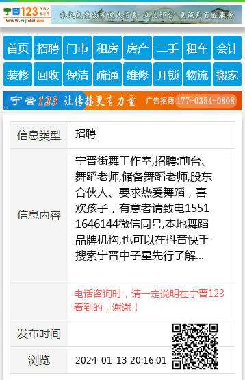 宁晋街舞工作室,招聘:前台、舞蹈老师,储备舞蹈老师,股东合伙人、要求热爱舞蹈,喜欢孩子,有意者请致电15511646144微信同号,本地舞蹈品牌机构,也可以在抖音快手搜索宁晋中子星先行了解 【电话咨询时,请一定说明在宁晋123看到的,谢谢!】 |