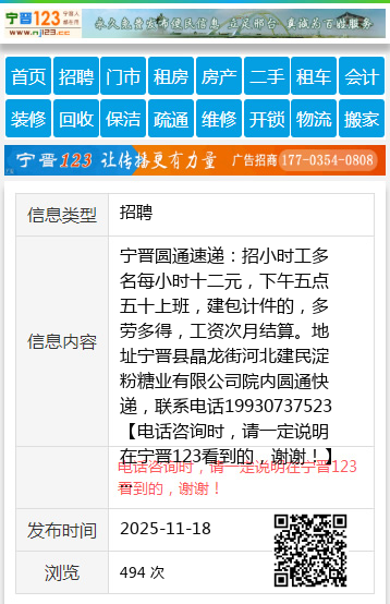 宁晋圆通速递:招小时工多名每小时十二元,下午五点五十上班,建包计件的,多劳多得,工资次月结算。地址宁晋县晶龙街河北建民淀粉糖业有限公司院内圆通快递,联系电话19930737523 【电话咨询时,请一定说明在宁晋123看到的,谢谢!】 |