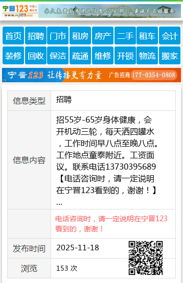 招55岁-65岁身体健康,会开机动三轮,每天洒四罐水,工作时间早八点至晚八点。工作地点童泰附近。工资面议。联系电话13730395689 【电话咨询时,请一定说明在宁晋123看到的,谢谢!】 |