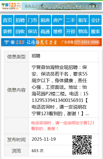 宁晋县怡海物业现招聘:保安、保洁员若干名,要求55周岁以下,身体健康,责任心强,工资面谈。地址:怡海花园P2楼二楼。电话:1513295339413400156931