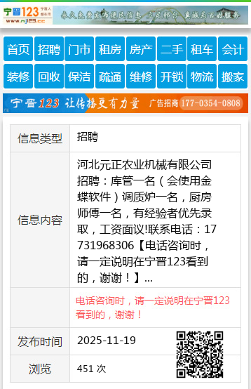 河北元正农业机械有限公司招聘:库管一名(会使用金蝶软件)调质炉一名,厨房师傅一名,有经验者优先录取,工资面议!联系电话:17731968306 【电话咨询时,请一定说明在宁晋123看到的,谢谢!】 |