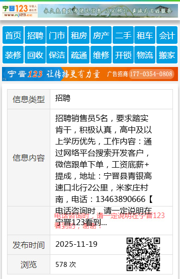 招聘销售员5名,要求踏实肯干,积极认真,高中及以上学历优先,工作内容:通过网络平台搜索开发客户,微信跟单下单,工资底薪+提成,地址:宁晋县青银高速口北行2公里,米家庄村南,电话:13463890666 【电话咨询时,请一定说明在宁晋123看到的,谢谢!】 |