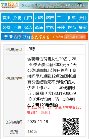 诚聘电话销售女性20名,26-40岁无责底薪3000元+4天公休➕提成➕节假日福利上班时间早八点到12点2点到6点有销售经验无不良嗜好的人优先工作地址:上城瑞府附近,联系电话18031909029 【电话咨询时,请一定说明在宁晋123看到的,谢谢!】 |