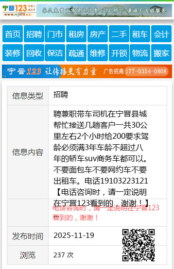 聘兼职带车司机在宁晋县城帮忙接送几趟客户一共30公里左右2个小时给200要求驾龄必须满3年车龄不超过八年的轿车suv商务车都可以。不要面包车不要网约车不要出租车。电话19103223121 【电话咨询时,请一定说明在宁晋123看到的,谢谢!】 |