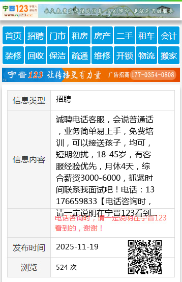 诚聘电话客服,会说普通话,业务简单易上手,免费培训,可以接送孩子,均可,短期勿扰,18-45岁,有客服经验优先,月休4天,综合薪资3000-6000,抓紧时间联系我面试吧!电话:13176659833 【电话咨询时,请一定说明在宁晋123看到的,谢谢!】 |