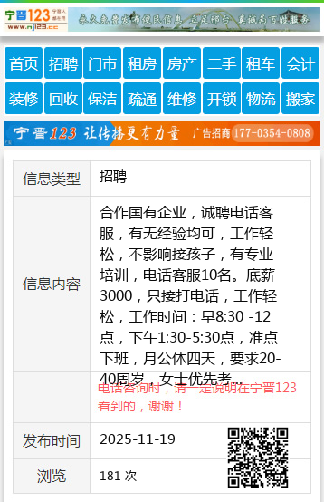 合作国有企业,诚聘电话客服,有无经验均可,工作轻松,不影响接孩子,有专业培训,电话客服10名。底薪3000,只接打电话,工作轻松,工作时间:早8:30 -12点,下午1:30-5:30点,准点下班,月公休四天,要求20-40周岁,女士优先考虑,工作简单,有无经验均可,长白班,地址:老车站附近 联系电话15731177212,名额有限,有意向请联系,20岁以下免打扰。 【电话咨询时,请一定说明在宁晋123看到的,谢谢!】 |