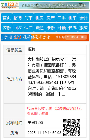 大村翻转犁厂招男零工,常年有活(懂图纸最好),另招业务员和直播销售,有经验优先,电话:15130968443,15933095483 【电话咨询时,请一定说明在宁晋123看到的,谢谢!】 |