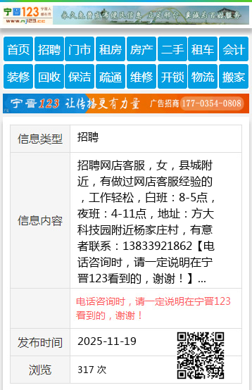 招聘网店客服,女,县城附近,有做过网店客服经验的,工作轻松,白班:8-5点,夜班:4-11点,地址:方大科技园附近杨家庄村,有意者联系:13833921862 【电话咨询时,请一定说明在宁晋123看到的,谢谢!】 |