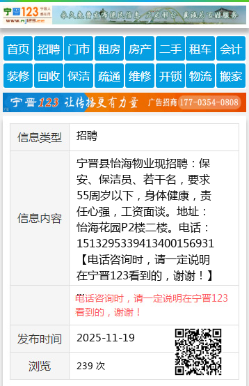 宁晋县怡海物业现招聘:保安、保洁员、若干名,要求55周岁以下,身体健康,责任心强,工资面谈。地址:怡海花园P2楼二楼。电话:1513295339413400156931 【电话咨询时,请一定说明在宁晋123看到的,谢谢!】 |