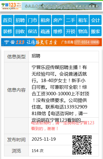宁晋乐迎传媒招聘主播!有无经验均可。会说普通话就行。18-40岁女士!新手小白可教。可兼职可全职!综合工资3000-10000上不封顶!没有业绩要求。公司提供住宿。联系电话13393290981微信 【电话咨询时,请一定说明在宁晋123看到的,谢谢!】 |