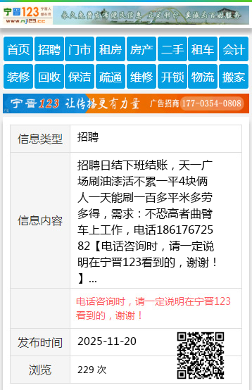 招聘日结下班结账,天一广场刷油漆活不累一平4块俩人一天能刷一百多平米多劳多得,需求:不恐高者曲臂车上工作,电话18617672582 【电话咨询时,请一定说明在宁晋123看到的,谢谢!】 |