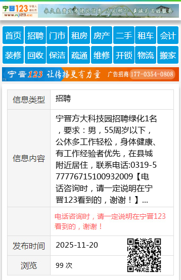 宁晋方大科技园招聘绿化1名,要求:男,55周岁以下,公休多工作轻松,身体健康、有工作经验者优先,在县城附近居住,联系电话:0319-577776715100932009