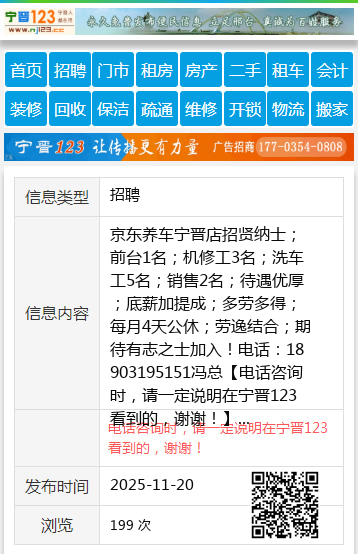 京东养车宁晋店招贤纳士;前台1名;机修工3名;洗车工5名;销售2名;待遇优厚;底薪加提成;多劳多得;每月4天公休;劳逸结合;期待有志之士加入!电话:18903195151冯总 【电话咨询时,请一定说明在宁晋123看到的,谢谢!】 |