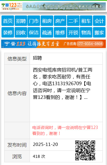 西安电缆库房招司机/普工两名,要求吃苦耐劳,有责任心,电话13131926709