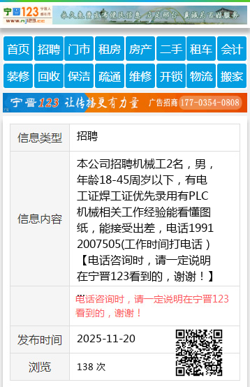 本公司招聘机械工2名,男,年龄18-45周岁以下,有电工证焊工证优先录用有PLC机械相关工作经验能看懂图纸,能接受出差,电话19912007505(工作时间打电话) 【电话咨询时,请一定说明在宁晋123看到的,谢谢!】 |