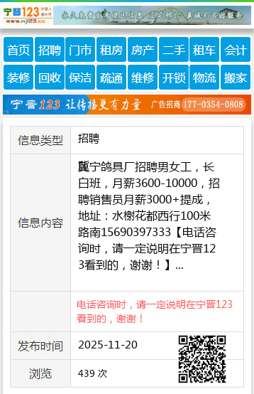 冀宁鸽具厂招聘男女工,长白班,月薪3600-10000,招聘销售员月薪3000+提成,地址:水榭花都西行100米路南15690397333 【电话咨询时,请一定说明在宁晋123看到的,谢谢!】 |