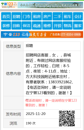 招聘网店客服,女,,县城附近,有做过网店客服经验的,工作轻松,白班:8-5点,夜班:4-11点,地址:方大科技园附近杨家庄村,有意者联系:13833921862、 【电话咨询时,请一定说明在宁晋123看到的,谢谢!】 |