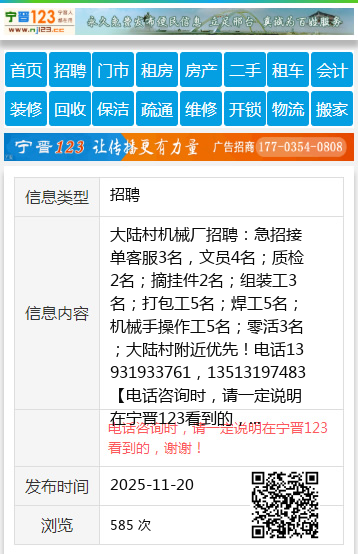 大陆村机械厂招聘:急招接单客服3名,文员4名;质检2名;摘挂件2名;组装工3名;打包工5名;焊工5名;机械手操作工5名;零活3名;大陆村附近优先!电话13931933761,13513197483 【电话咨询时,请一定说明在宁晋123看到的,谢谢!】 |