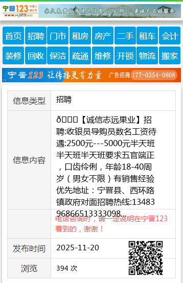 🍒【诚信志远果业】招聘:收银员导购员数名工资待遇:2500元---5000元半天班半天班半天班要求五官端正,口齿伶俐,年龄18-40周岁(男女不限)有销售经验优先地址:宁晋县、西环路镇政府对面招聘热线:1348396866513333098515微信号:手机号同步有兴趣的小伙伴,可以私信我